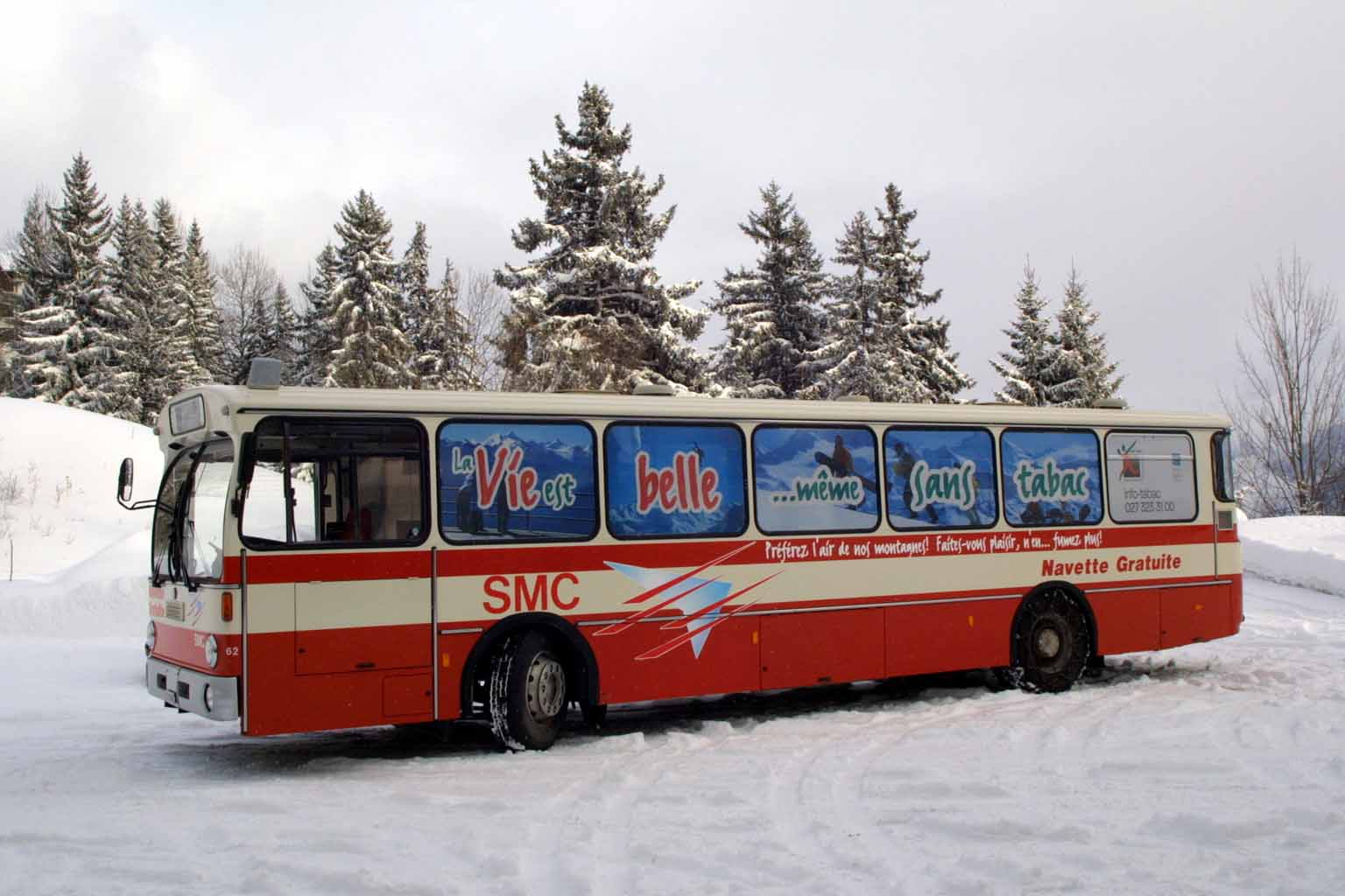 Message anti-tabac, affiché sur les pistes de ski, par le groupe "Faites-vous plaisir, n'en... fumez plus". Une des nombreuses action de sensibilisation réalisée par le PAES. | La campagne de sensibilisation du projet Faites-vous plaisir n'en.. fumez plus s'est concrétisée l par la mise en circulation de deux bus de la compagnie SMC qui véhiculent un slogan anti-tabac d'un bout à l'autre de la station (photo PAES Patrick de Morlan). Pour en savoir plus: cliquez ici! | ||