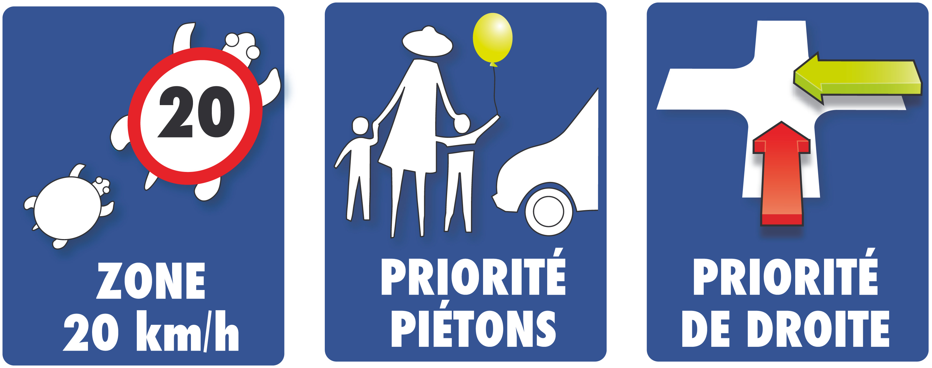 piétons, vitesse limitée à 20 km/h et priorité de droite.